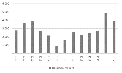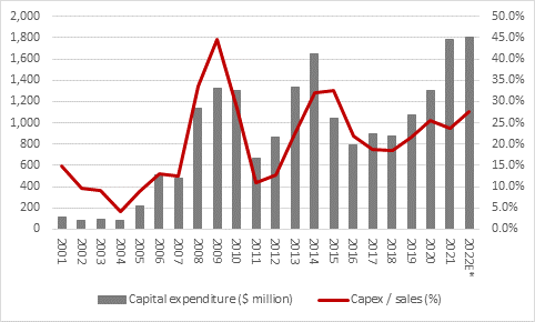 “The Chilean company’s management team seem confident in the future. Capital investment in 2022 is expected to largely match 2021’s all-time figure of $1.8 billion, although that does not match prior peaks on a percentage of sales basis.