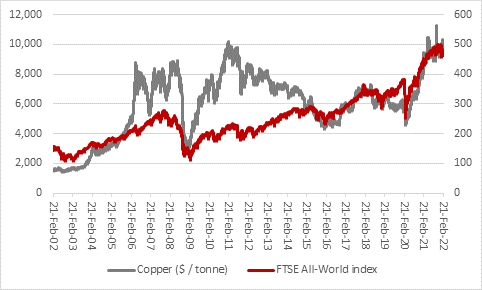 “Again, firm copper prices could leave those forecasts looking pessimistic and although the opposite also holds true investors are more likely to want to see strong rather than weak demand for the metal, which has over time been an uncanny guide to the global economy and also global equities, as benchmarked by the FTSE All-World index.”