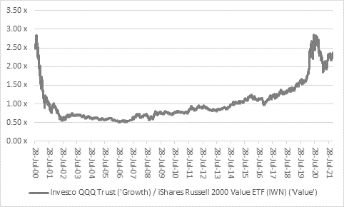 “This can be seen in the relative performance of the QQQ compared to the iShares Russell 2000 Value ETF over the past couple of years. The ‘value’ tracker has risen by 76% in value, compared to the QQQ’s 60% gain.