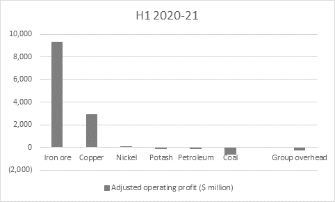 “BHP has six main product areas. They are iron ore, copper, petroleum, coal (both metallurgical and energy), nickel and potash but on the basis of the company’s mix of adjusted operating profit from the first half iron ore and copper are the materials that really count.