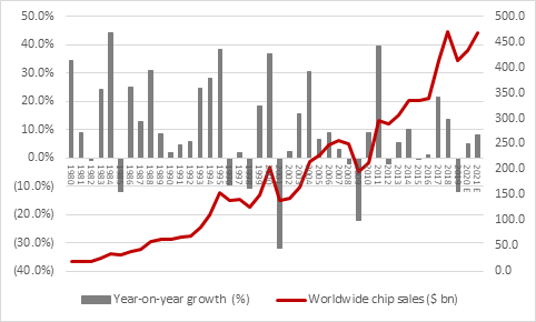 “Any industry that can point to 8% compound annual revenue growth over a span of 40 year must be doing something right and the global semiconductor business is back in focus again as car makers confront disruption to production caused by a shortage of silicon chips,” says Russ Mould, AJ Bell Investment Director. “The semiconductor industry is notoriously boom and bust but it grew in 2020, despite the pandemic and global recession, and industry forecasts suggest it poised to do so again in 2021, especially if the virus is beaten off and economic activity picks up. From the narrow perspective of financial markets, this leaves investors with three issues to address:
