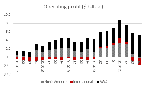 4. North America went into loss in the fourth quarter and International was in the red for the whole year. North America had not made a quarterly loss since Amazon first published operating profit by division back in 2015. International made a maiden annual profit in 2020 but slipped back into loss in 2021. Again, this shows the cost pressures which face the online delivery businesses and flags the importance to Amazon of its cloud computing operation AWS, which generated three-quarters of group operating profit in 2021 overall and all of it and more in the final three months of the year. That high-quality business is the core of Amazon and in many ways the foundations upon which it rests.