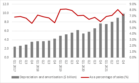 6. Profits guidance for the first quarter implies a further big drop and even though it is flattered by an accounting change. Management steered first quarter operating profit forecasts to between $3 billion and $6 billion. The $4.5 billion mid-point of that range compares to $8.9 billion and implies a third straight year-on-year drop. Moreover, that forecast assumes a $1 billion drop in depreciation expense as Amazon now believes its servers and networking equipment will last longer than previously assumed. Even on a sales base north of $100 billion a quarter a $1 billion drop in depreciation charges equates to around one percentage of operating margin, a significant number when management forecasts imply around a 4% operating margin for Q1 2022. Such accounting sleight of hand is not an ideal way of ensuring profit forecasts are met and the lofty valuation really requires a higher-quality source of earnings than that, if it is to be sustained.