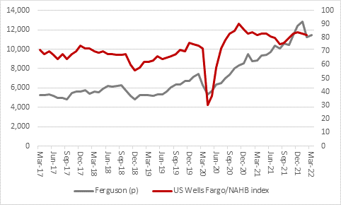 “The headline Wells Fargo/NAHB housebuilding industry survey for the US peaked in late 2020 and that may have begun to weigh on Ferguson’s shares, since residential sales generate around 55% of total revenues with the rest coming from commercial and industrial buildings as well as utilities and waterworks. If the Federal Reserve gets aggressive on interest rates that could dampen activity and sentiment toward the stock, although it is still by no means impossible that the Fed backs away from its vaguely tough talk and takes its chances with inflation, if the US economy really slows or financial markets turn turtle.