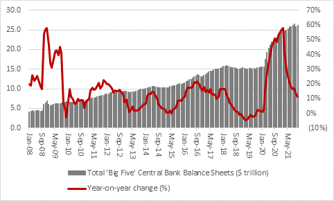 “Unfortunately, no discussion of financial markets can be complete without an assessment of central bank policy, as the above commentary makes only too clear. The monetary authorities have their fingers in more pies than Mr. Kipling: interest rates have been kept at historic lows since spring 2020 and Quantitative Easing, asset-buying programmes designed to suppress interest rates, force cash into financial markets and create a so-called wealth effect mean that balance sheets have ballooned. In aggregate, the balance sheet of the Bank of England, Bank of Japan, European Central Bank, Swiss National Bank and US Federal Reserve has grown by: