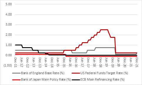 Source: Bank of England, Bank of Japan, European Central Bank, Swiss National Bank, US Federal Reserve, Refinitiv data