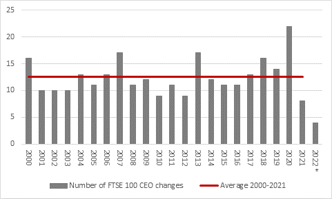 “That compares to the average of 12 to 13 changes in FTSE 100 CEO since 2000 and the previous low for this millennium of nine new bosses in each of 2010 and 2021. Four more changes in CEO were announced in 2021 but they only become effective in 2022 and in one of those instances – Johnson Matthey – the firm has dropped out of the FTSE index subsequent to the appointment of a new leader.