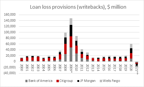 Source: Company accounts. *JP Morgan figure for 2009 excludes $8.9 billion in other write-downs. *2021 to date, first three quarters only.