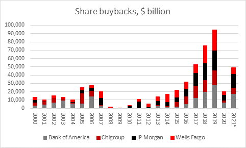 “For 2023, analysts think the US banks’ pay-outs will return to their former highs and that is with buybacks on top. In the first nine months of 2021, the US Big Four bought back $49 billion of stock, more than any full year this century bar 2018 ($75 billion) and 2019 ($94 billion).