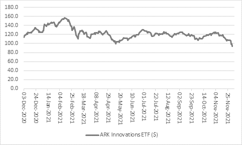 “And Cathie Wood’s ARK Innovations Exchange-Traded Fund, that is packed with potentially disruptive technology names such as Tesla, Teladoc, Roku, Coinbase, Square and Twilio is deep in its own private bear market. The NASDAQ Composite may be only 6% off its highs but the ARK Innovations ETF is down by 18% over the past year and now stands some 40% below its February peak. Someone, somewhere is taking the view to move away from highly-valued technology stocks where a lot of growth is already priced in and the value of their future earnings declines if interest rates and discount rates go up.