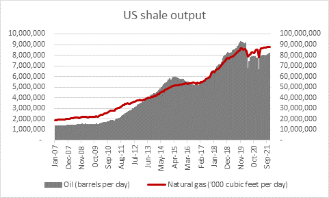 “US shale production is barely growing at the moment, either, so it will be interesting to see if output does ramp up in the coming months as those rigs get cracking, especially as production per rig is so much higher than it was a decade and more ago, although questions do still remain over depletion rates and how quickly rigs may need to shift from well to well.