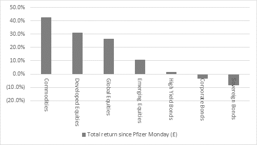 “In terms of asset classes, the best performer since ‘Pfizer Monday’ has not been equities but commodities. The Bloomberg Commodities index is up by 42%, easily outpacing the 26% gain in the FTSE All-World equity benchmark. Bonds have struggled. High-yield (or so-called ‘junk’) bonds have offered meagre total returns and investment-grade and sovereign, or Government, paper have served up losses.