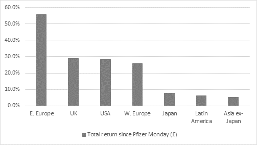 “The return to favour of Eastern Europe and the UK among investors is reflected in which equity sectors have done best since Pfizer Monday. Like the US, technology has continued to do well, offering a 29% total return in sterling terms, but also like the US it has been surpassed by two alternatives, in this case Energy and Financials.