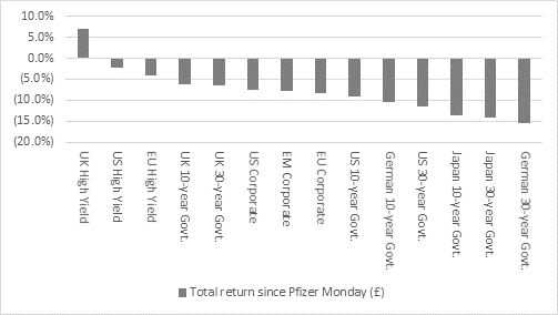 “The one asset class that has fallen from favour since ‘Pfizer Monday’ is bonds. Fixed-income, in theory a haven asset, has offered little downside protection over the past year with every sub-asset class generating negative total returns, with the exception of high-yield bonds in the UK. Even this tallies with the ‘inflationary recovery’ scenario, as high-yield debt issuers tend to be in some degree of financial distress but are more likely to come out of the other side of a crisis unscathed if there is a rapid upturn in business. That means they will be less likely to fold and more likely to pay their interest on time, increasing the value of their bonds to investors.