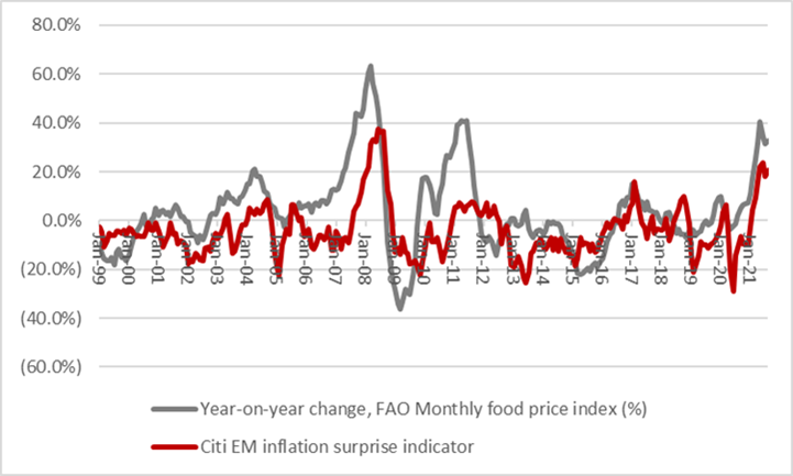 “Emerging markets are a case in point. It is possible to argue that food prices are a much bigger issue, if the apparent correlation between the cost of foodstuffs and an indicator inflation surprises is any guide. In this context it is no wonder that emerging markets such as Brazil, Russia and Mexico are leading the charge when it comes to interest rates rises in 2021.