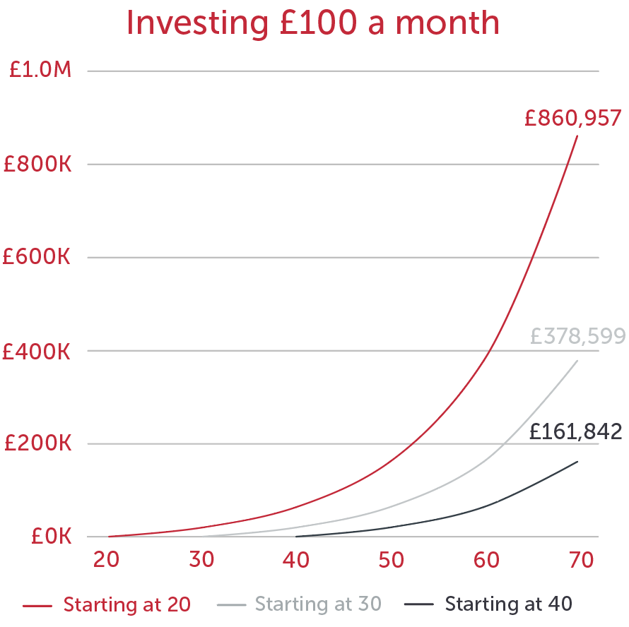 One of the benefits of early investing is it allows you to build your pot through compounding. Compound interest is the cumulative interest your savings and investments can build up over time, so the return is applied not just to the initial amount you save, but any returns you also reinvest.