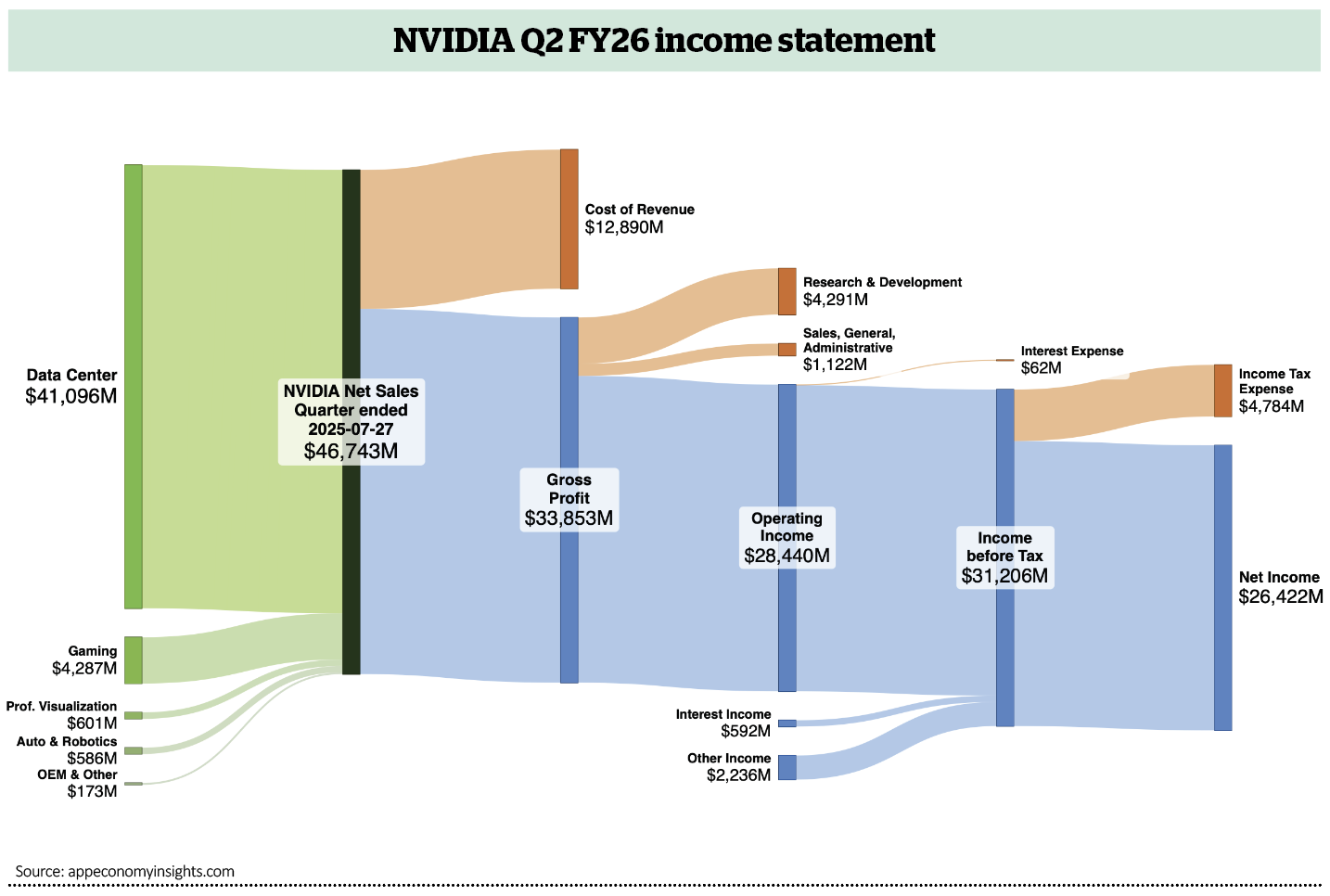 Putting some colour on the China issues, Nvidia said data centre revenue, its largest and most critical division, came in at $41.1 billion, missing analysts’ projection of $41.34 billion. Of that, $33.8 billion of Nvidia’s data centre sales were for Nvidia’s GPU chips, down 1% from the first quarter because of $4 billion fewer H20 sales because it sold none of these chips to China in the quarter to end July.
